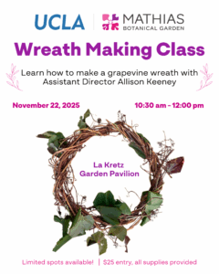 Get in the holiday spirit at this festive class on Saturday, November 22 from 10:30 am to 12 pm in La Kretz Garden Pavilion! Assistant Director Allison Keeney will lead a hands-on workshop about how to make a grapevine wreath like the one featured on the flyer to adorn your door.